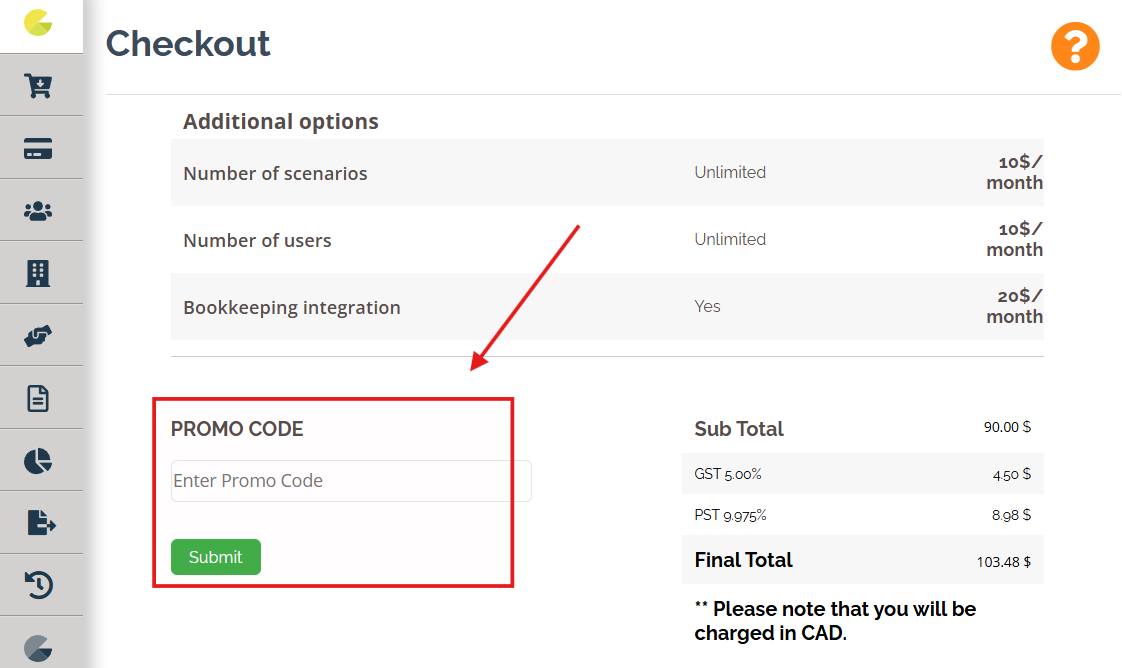 - IMPORTANT! Make sure the options you selected matches the promocode you received. For example, if your promo code was for 10% off a yearly subscription with all options, make sure you select Yearly payment, and click to add all options.